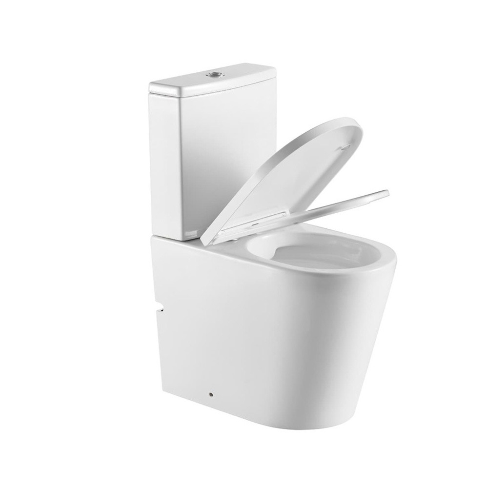 It features a rimless toilet bowl with a universal waste outlet, a cistern with a flush mechanism, and a soft-close toilet seat with quick-release feature.