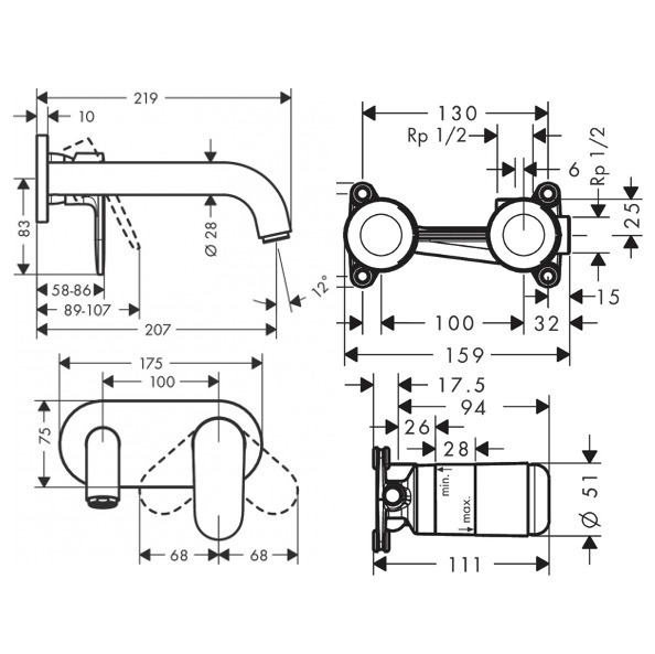 Features of the Vernis Blend Set Concealed wall-mounted washbasin mixer, 207 mm spout + concealed body, Matt black (71576670-SET) :