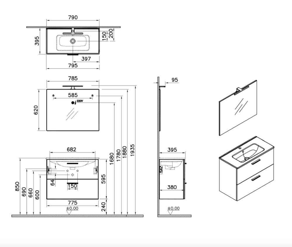 Bathroom furniture set packaged in one box. The set includes a ceramic sink, a wall-mounted sink cabinet in oak color with 2 drawers, a wall mirror, LED lighting, and waste fittings.