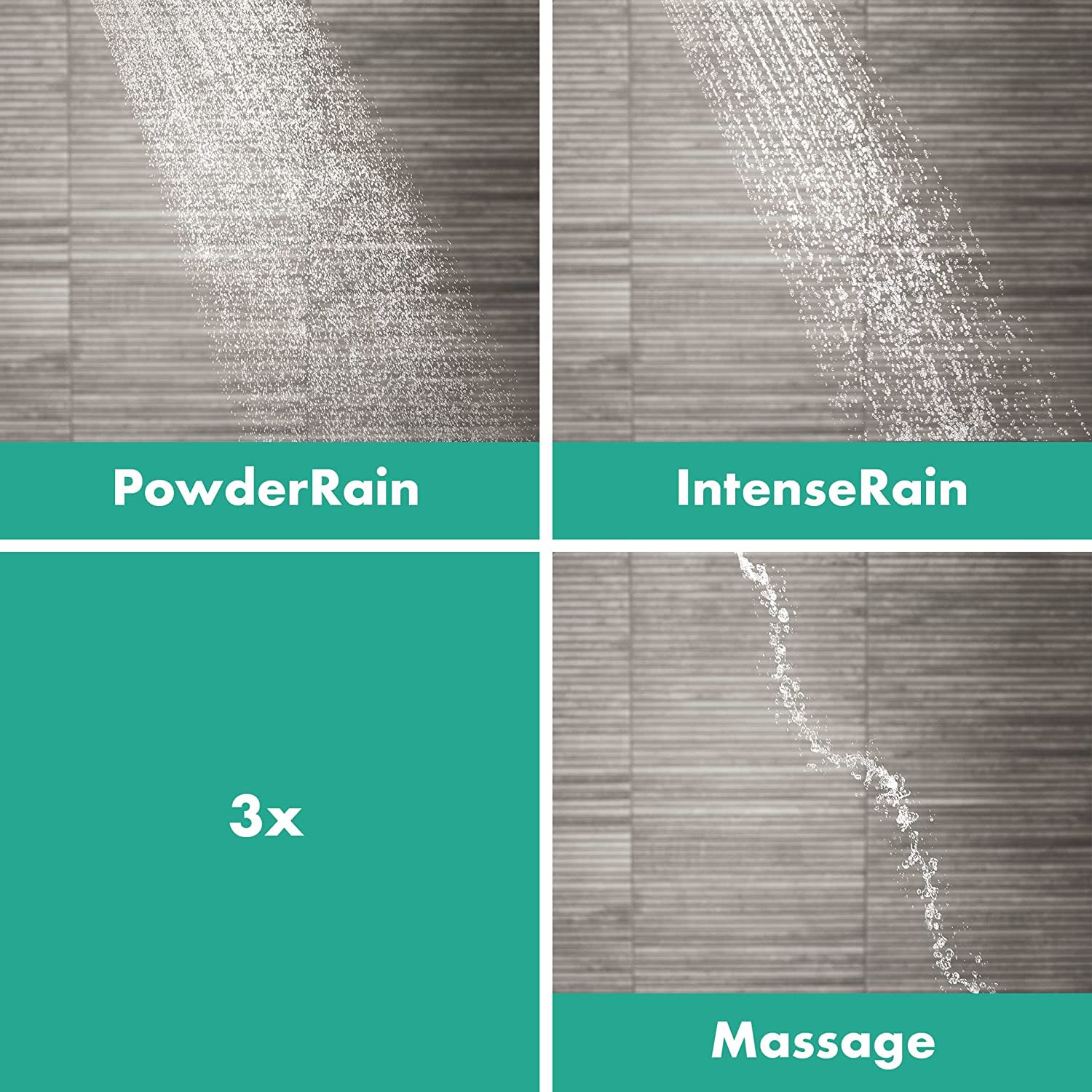 - Spray pattern: Massage spray, IntenseRain, PowderRain