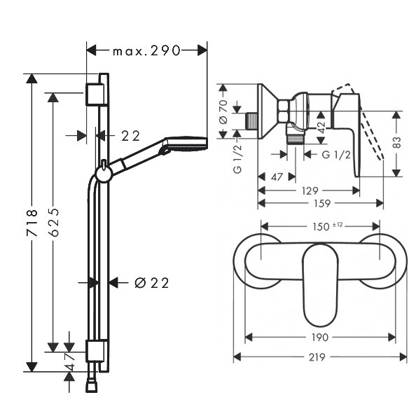 - Includes: Hand shower, Shower bar, Shower hose, Slider
