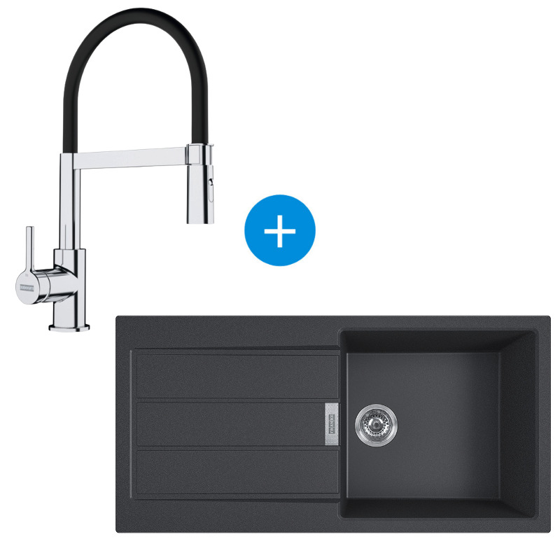 Franke Sirius Built-in sink 100×50cm with drainer, Black + 205x410mm semi-pro mixer, pull-out spray, Chrome/Black