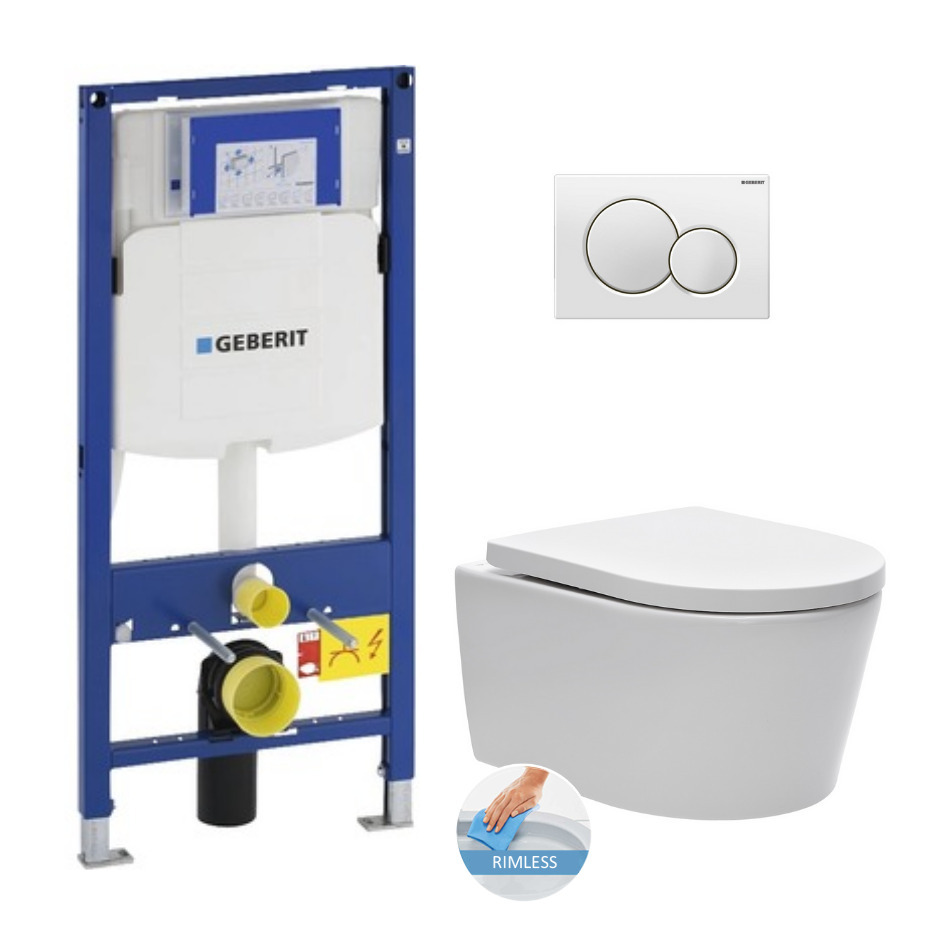 Geberit Toilet set support frame with SAT rimless bowl, invisible fixings + softclose seat + Flush plate (GebSatrimless-B)