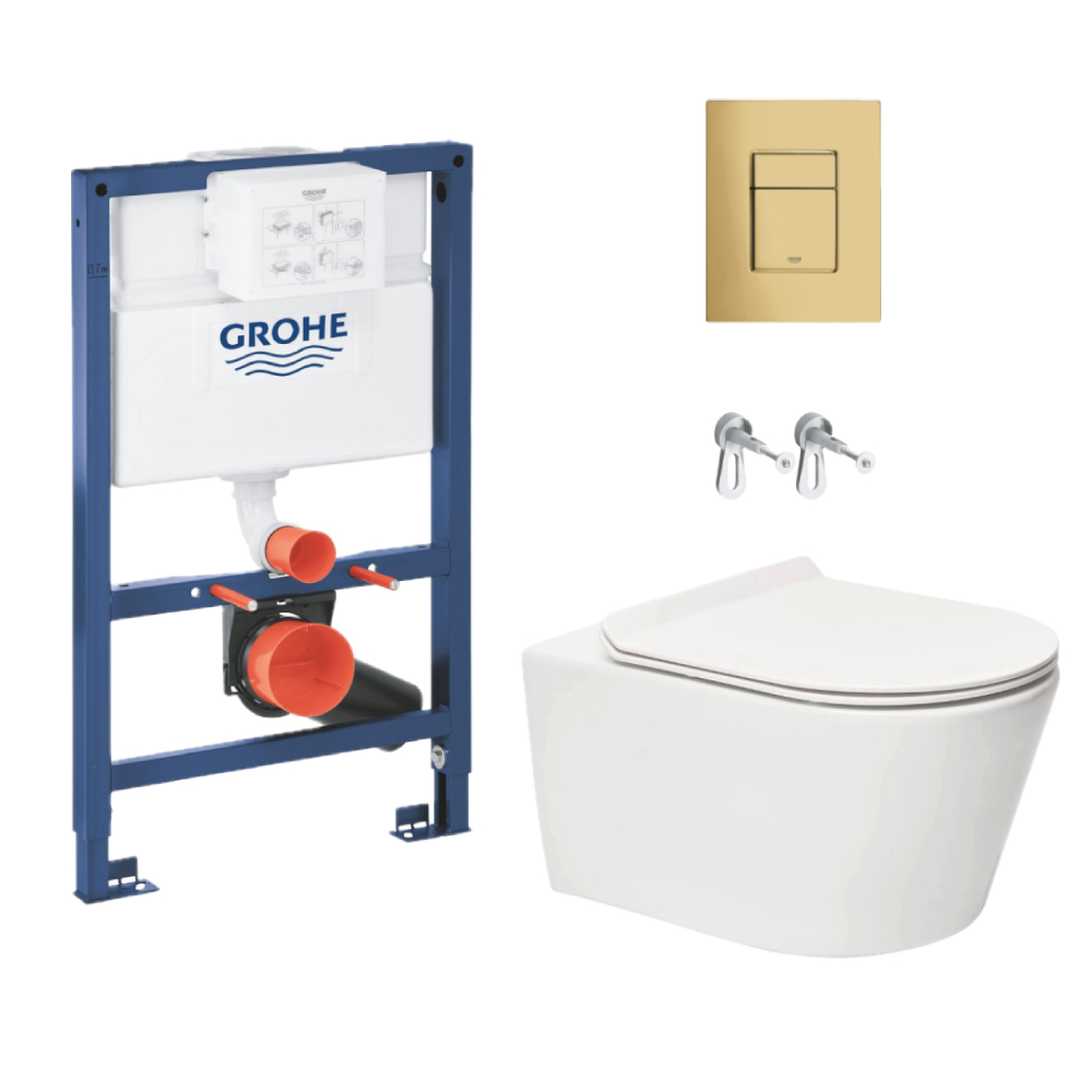 Grohe Toilet Pack Grohe Rapid SL Frame + Brevis Rimless Wall-Hung Toilet + Brushed Gold Plate (RapidSLBrevis-bgold-82)