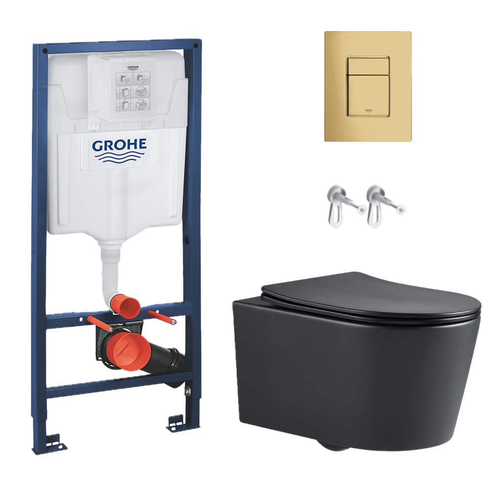 Grohe Toilet Pack Grohe Rapid SL Frame + Black SAT Rimless Toilet + Gold Mirror Effect Flush Plate (RapidSLBlackSAT-gold)