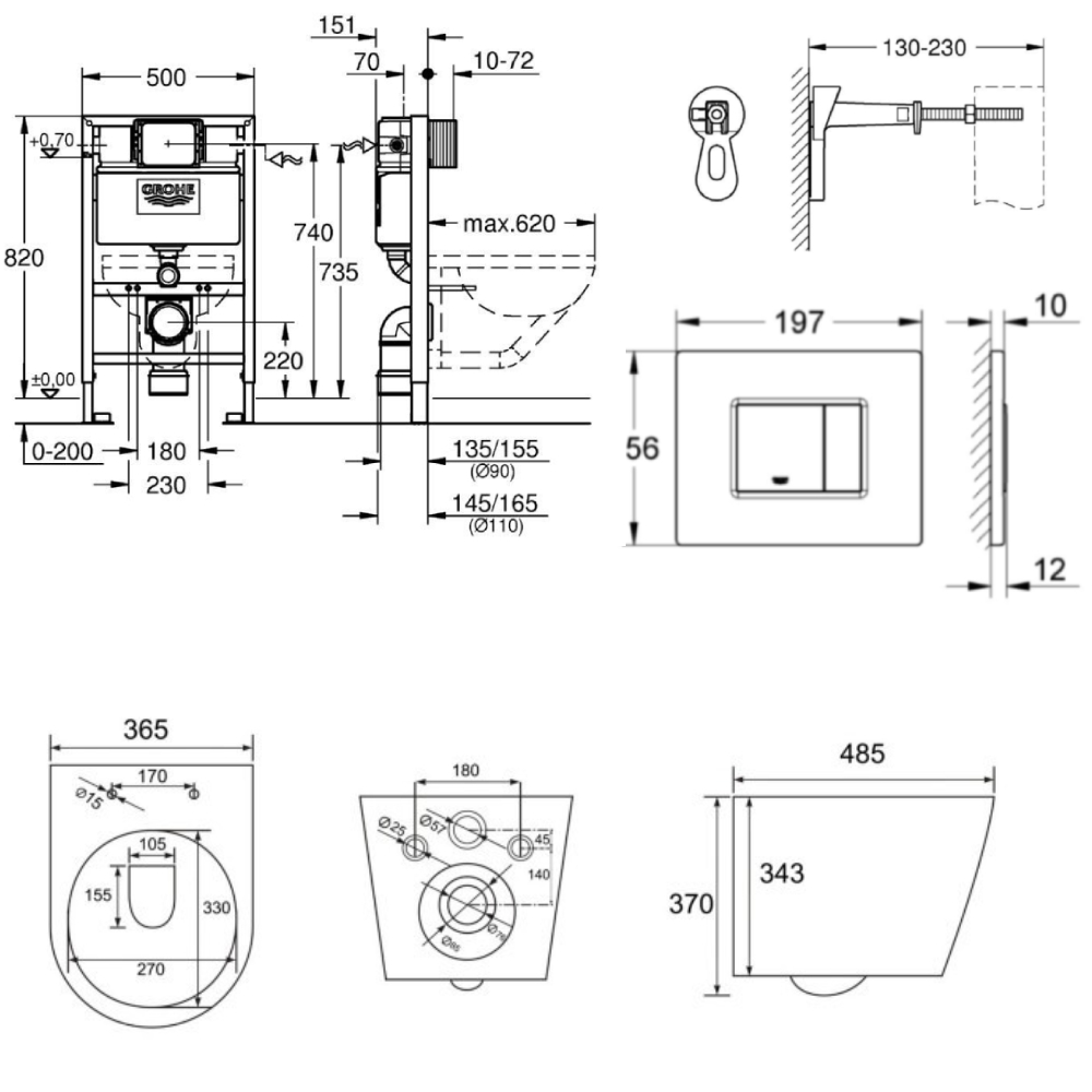 Features of Toilet Pack Grohe 0.82m Low Height Rapid SL Frame + Infinitio Rimless Toilet + Grohe Gold Mirror Effect Flush Plate (RapidSLInfinitio-gold-82):