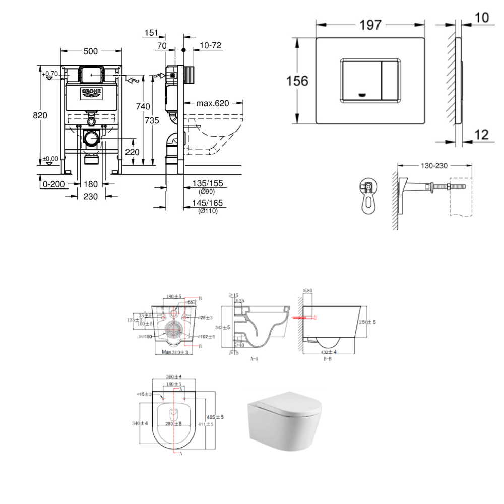 Features of Toilet Pack Grohe Low-Height Rapid SL Frame + SAT Rimless Toilet + Grohe Brushed Hard Graphite Flush Plate (RapidSLSAT-AL0-82):