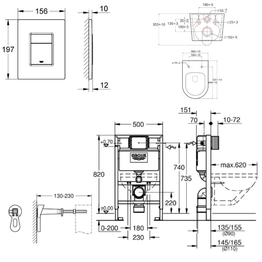 Grohe Toilet Pack Grohe 0.82 m Rapid SL Frame + Brevis Rimless Toilet + Brushed Hard Graphite Flush Plate (RapidSLBrevis-AL0-82)