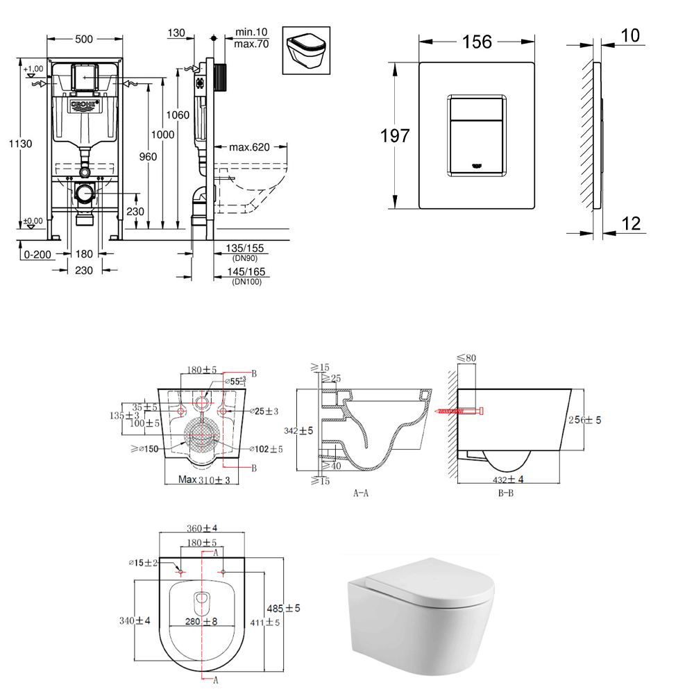 - Design and Modernity: Give your bathroom a contemporary look with the elegant design of the wall-hung SAT Rimless Toilet and the Grohe Matt Black Skate Cosmopolitan Flush Plate.