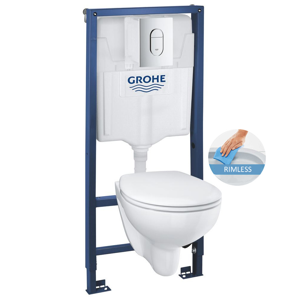 This WC pack features products from the Grohe brand, including the Rapid SL support frame with a chrome control plate, along with the rimless Bau Ceramic toilet bowl and its detachable soft-close seat.